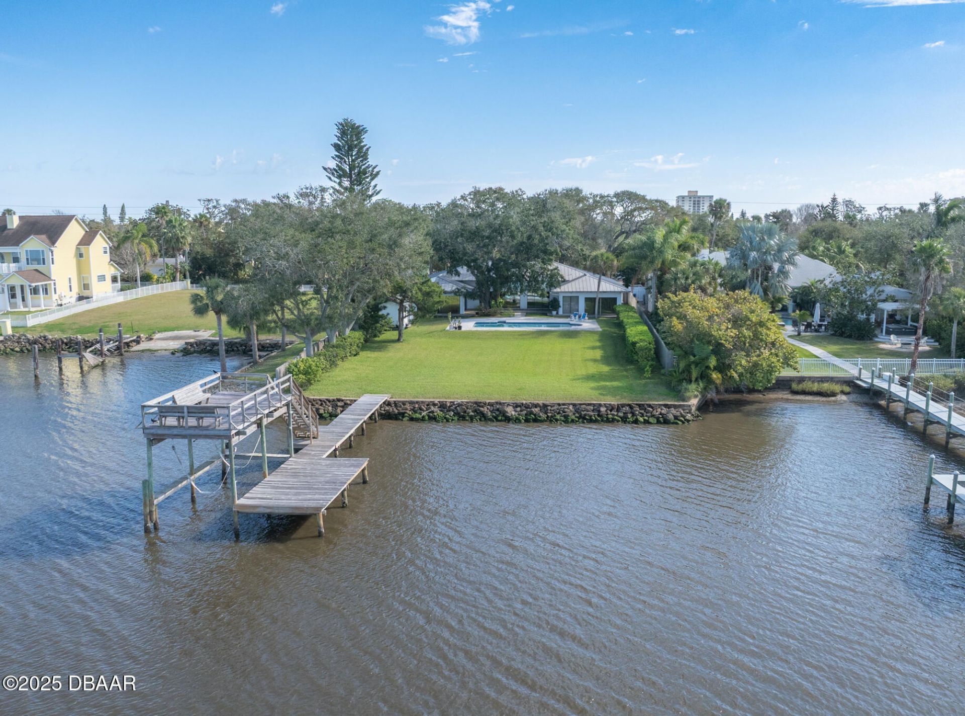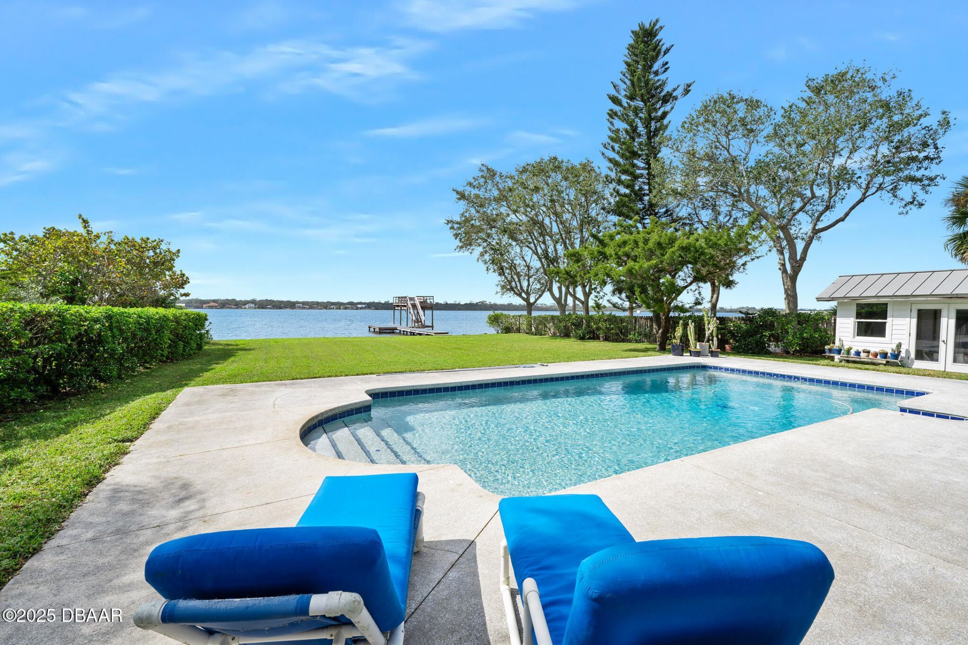 AVAILABLE for immediate possession! Price is firm. Lovely direct riverfront pool home on a sprawling, oak covered parcel of land with a John Anderson Address. 4300 sq ft concrete block 3 bed, 3 bath home features a family room, dining room, living room with fireplace, dedicated home office, sun room, and a large indoor utility room. A central island kitchen opens onto the grand riverfront great room where handsome tongue-n-groove ceilings hover above classic mid-century transom windows placed just above a wall of glass doors that allows for panoramas of the passing boats, sparkling blue pool and a fabulous grand oak tree that shades the riverside verandah. Step into the gracious waterfront owners' suite to find a series of sliding glass doors that create yet another glass wall bringing the sights of the Halifax River indoors. Two walk-in closets and a generous bath with river view soaking tub. A second waterfront suite with private bath features a private sitting area or office and ... the third bedroom also has it's own additional den or office. The two car garage is double deep on the north end and could accommodate 3 cars parked tandem. Vertical seawall plus a coquina rock revetment and a beautiful dock with boat lift under a 2nd story observation deck that overlooks the serene Tomoka Basin in the distance.