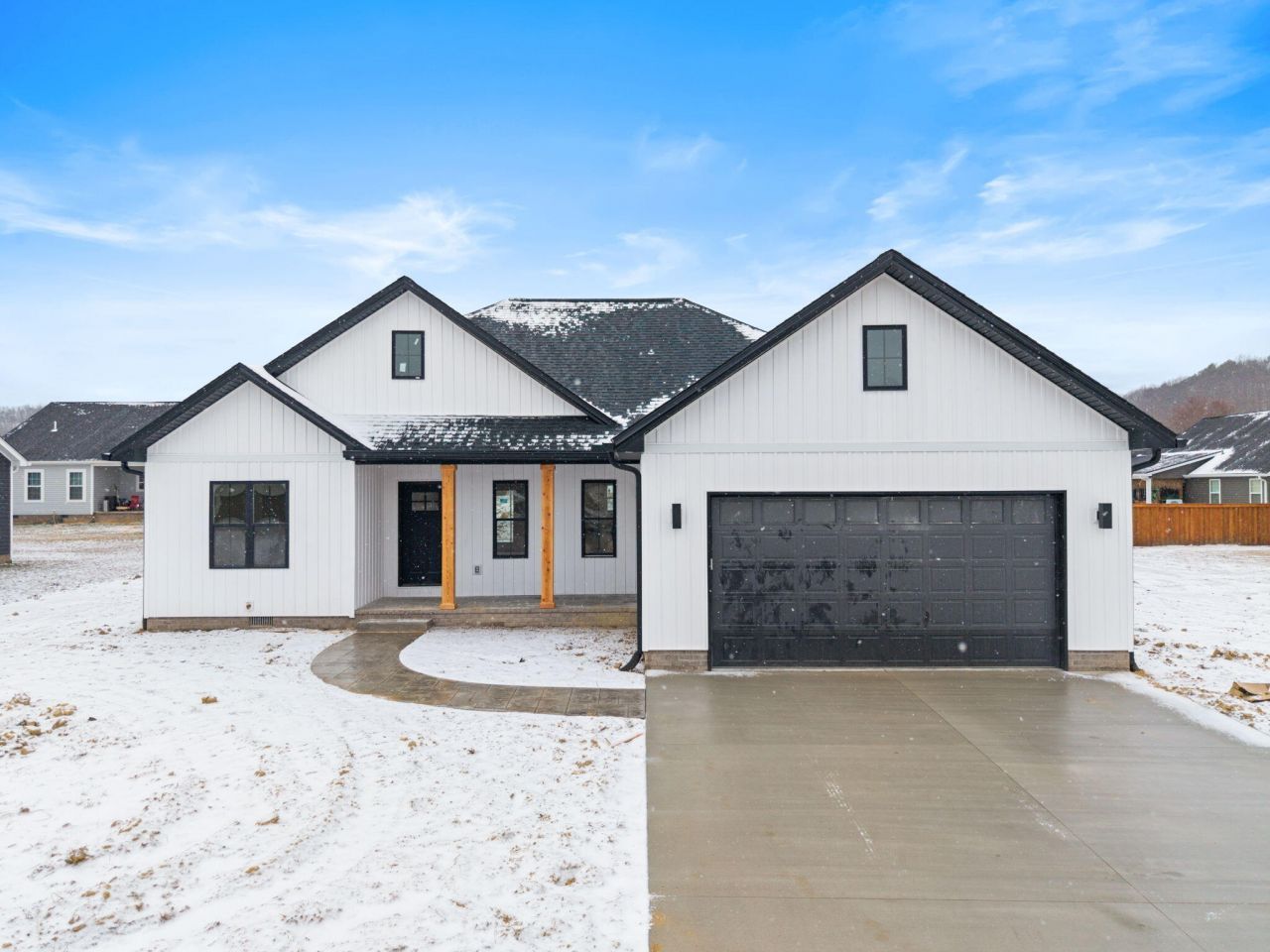 Welcome home to this thoughtfully designed new construction located in a brand-new Knob View Trace subdivision. Offering 3 bedrooms, 2 baths, and approximately 1,500 sq ft of comfortable living space. Quality details are found throughout, creating a home that feels both fresh and functional. Kitchen features custom cabinets, quartz countertops, and stainless steel appliances. The primary suite features a walk-in tile shower, soaking tub, and a large walk-in closet, providing a relaxing retreat. Two additional bedrooms are spacious and well laid out, ideal for everyday living, guests, or a home office. Enjoy outdoor living with a covered front porch and covered back patio. A well-built, move-in-ready home in a growing new community. Home will be completed in March 2026 **More photos to come** Under contract with 48 hr kickout clause