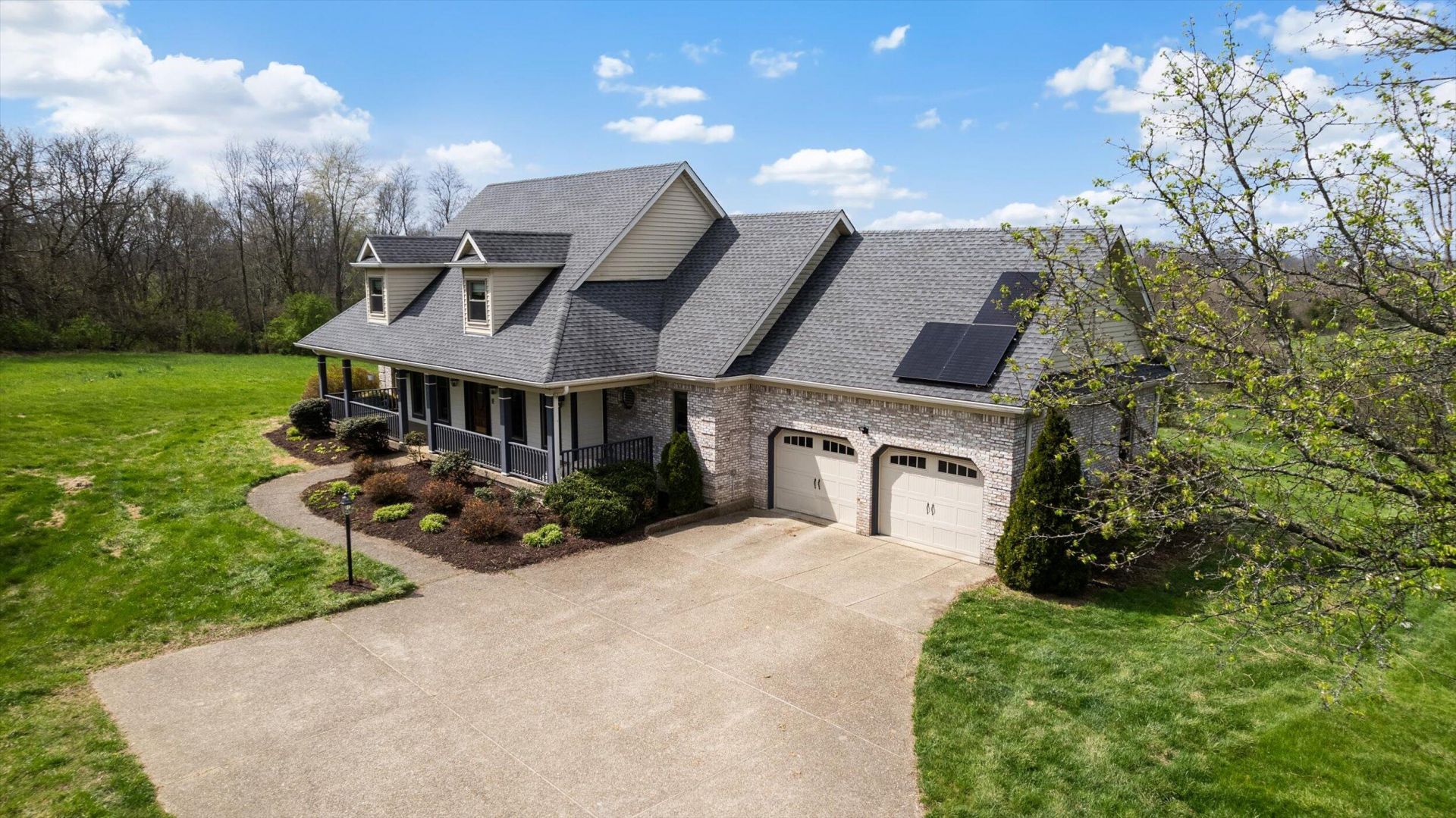 Best deal in central Kentucky. Turn key nearly 60 acre horse farm with custom built home and newly built indoor arena. The brick home with porch swing/ rocking chair ready covered front porch offers 4 Bedrooms, 3.5 baths. The first-floor primary suite has a walk-in shower, whirlpool tub, and double vanities with marble countertops. The kitchen has been updated with quartz countertops, a gas cooktop prep island, and a stainless appliance package. A vaulted great room with a wood-burning fireplace anchors the main living space. Two upstairs bedrooms share a Jack-and-Jill bath, each with a built-in window seat and walk-in closet. The lower level adds a second fireplace, an exercise room with hot tub, a private safe room, a full bath, and a workshop. This area could easily be converted into a separate living quarters for multigenerational living arrangement or perhaps on site staff housing.Recent updates include: new windows, solar panels reducing energy costs, whole-home generator hookup, air scrubber for indoor air quality and new carpet. Along with the 2 car attached garage there is a detached three-car garage with one bay insulated, heated, and plumbed with 220-volt service, ready made workshop space. The 166x66 indoor arena was built new in 2024 and is fully insulated, with three Big Ass fans, six stalls with exterior Dutch doors, and a hot-and-cold wash rack. A 30 by 30 vintage stock barn, a 10 by 20 loafing shed, and a 10 by 16 storage building round out the outbuildings. Wooded trails wind through the back acreage. For the hobby farmer, horse trainer, backyard equestrian, auto enthusiast, or homesteader this property offers versatility of use and at a tremendous value. Located in the golden triangle of Louisville, Lexington and Cincinnati. 50 minutes to SDF, 66 minutes to CVG, and 75 minutes to Kentucky Horse Park. 5 minutes to I-71 gives quick access to anywhere you need to go.