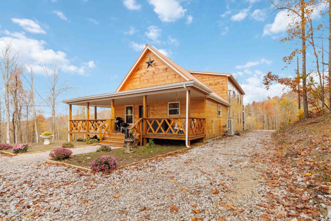 Like new 2230 sq. ft., cabin, sitting on 10+/- acres of land. Sit on your wrap around porch and enjoy nature as it fully surrounds you. The rolling hills, mature trees, and wildlife it offers is a great way to unwind from the face paced life many of us live. Wait until you see all the beautiful interior wood in person. It truly brings the feeling of the outdoors into the interior. It has the feeling of a resort home you might find when on vacation. The main level has everything you need for comfortable daily living, including, living room, kitchen, bedrooms, full bath and laundry room. Upstairs you will find a large loft style bedroom, full bath, and your own private balcony. So, if you've been dreaming of a quiet getaway, or your very own permanent home with peacefulness, this hidden gem is waiting for you. Feel miles from everything, yet you're just 15 minutes to Berea, 20 minutes to Richmond, and less than an hour to Lexington. (Use address 917 State Hwy 3447, McKee, KY 40447) This will be the first cabin you come to once you turn by the real estate sign.