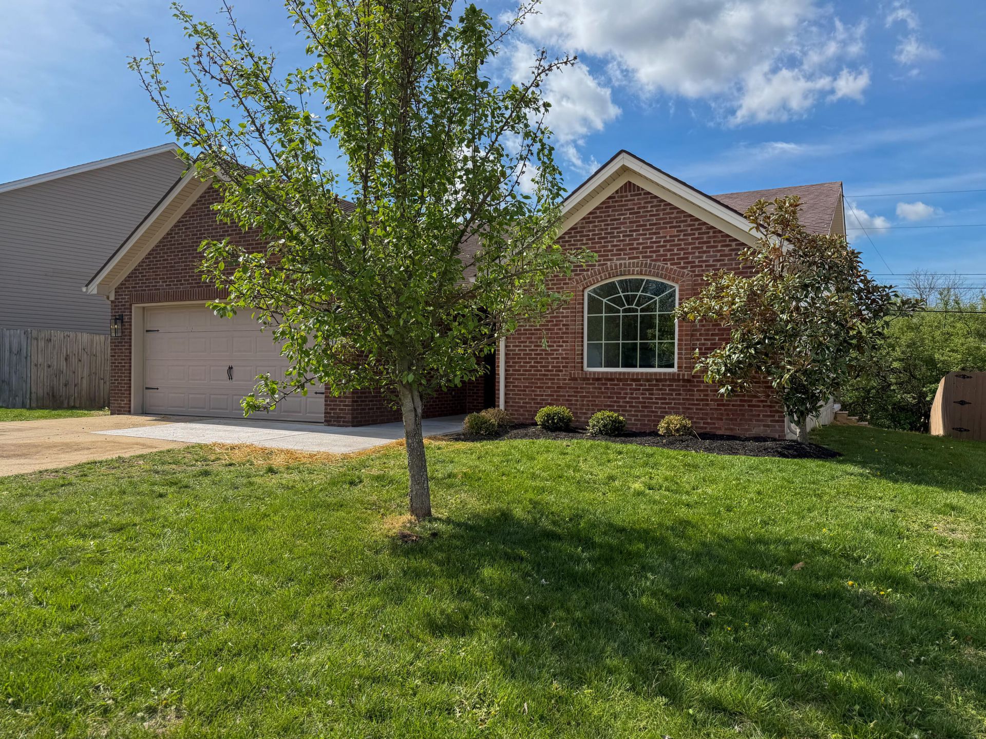 Move-in ready! Ranch floor plan with 3 bedrooms and 2 full bathrooms in Nicholasville's Brittany Heights. This home is conveniently located between Main Street and the Nicholasville Bypass. This home has just been painted, new carpet installed and new light fixtures. Enter through foyer with coat closet. Kitchen is to the right with tons of natural light and a pantry. Brand new stainless steel refrigerator, dishwasher, range + microwave to be installed. Room in kitchen for a breakfast table. Open living room and dining room. The primary bedroom features a vaulted ceiling with ceiling fan, access to the rear covered patio, private bathroom with large walk-in closet + linen closet. Two additional bedrooms with a full bathroom featuring a tiled shower. Covered rear patio. Separate laundry room. Broker/owner.