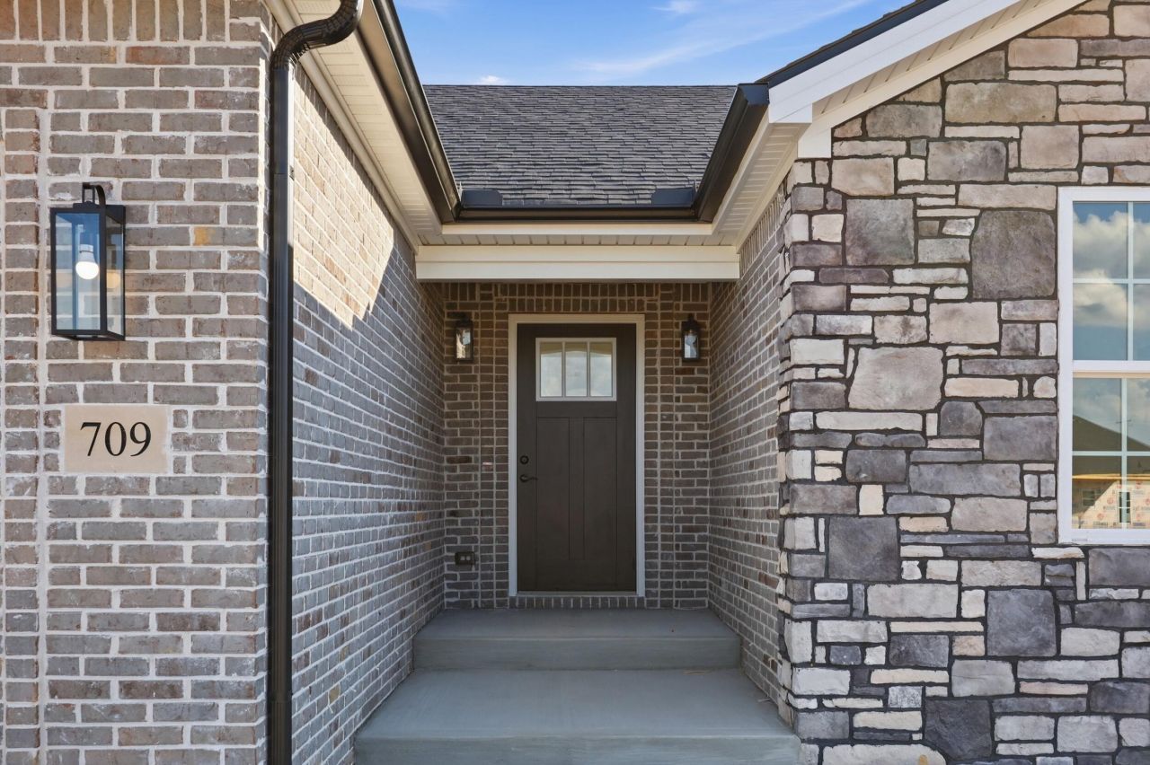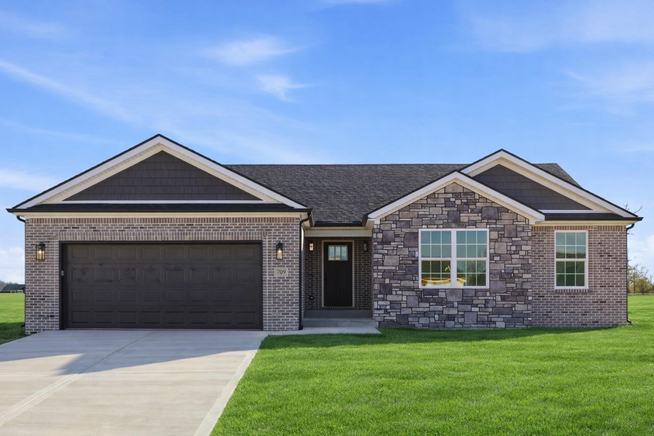 This stylish new 3BR/2BA home is perfectly situated on a level lot at 0.21 acres, offering both comfort & curb appeal. With beautiful shake-style siding accented by stone & brick, the exterior makes a stunning first impression. Step inside to discover an open, split-bedroom floor plan featuring luxury vinyl plank & tile flooring throughout. The light/neutral paint provides a soft, neutral backdrop that complements the black hardware & rich trim details throughout the home. The spacious great room is highlighted by soaring vaulted ceilings and an electric fireplace w/eye-catching trim, creating a bright & welcoming atmosphere. The fully equipped kitchen boasts white cabinetry, an accent island with seating, sleek light quartz countertops, stainless appliances, tile backsplash, a large pantry & generous dining space, perfect for entertaining or everyday life. Retreat to the serene owner's suite w/luxurious tiled shower, dual vanities, & a roomy WIC. 2 additional BR's offer privacy & flexibility for guests, family or office space. Addl features include a sizable laundry room, an oversized garage, and a level backyard & 18 x 12 covered patio.