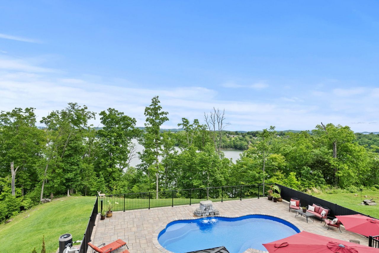 This extraordinary lakefront estate on the cliffs of Lake Cumberland delivers the perfect balance of comfort, elegance, and premier entertaining. Offering six spacious bedrooms and nearly 7,000 square feet of refined living space, this showstopping residence sits on a generously sized lot with breathtaking water views. Step inside to soaring coffered ceilings and a striking stone fireplace that anchors the main living area. The chef's kitchen is beautifully appointed with high-end finishes, abundant cabinetry, and an oversized walk-in pantry, ideal for hosting gatherings both large and small. Designed for seamless indoor-outdoor living, the expansive tiered deck overlooks the lake and creates a private resort-style retreat. Unwind in the hot tub with an evening cocktail, take a swim in the heated saltwater pool, or simply enjoy the peaceful setting where a herd of deer, squirrels, and even eagles make frequent appearances. The thoughtfully designed layout features a luxurious first-floor primary suite, a secondary kitchenette in the finished basement for guests or multi-generational living, low-maintenance flooring, a dramatic wide staircase, and a spa-inspired soaking tub. Evenings are best spent in the cozy home theater, creating the ultimate cinematic escape. Car collectors and outdoor enthusiasts alike will appreciate the expansive garage space with ample room for multiple vehicles, watercraft, and recreational equipment. Experience lakefront living as it was meant to be ??? peaceful, polished, and unforgettable. All that's missing is you!